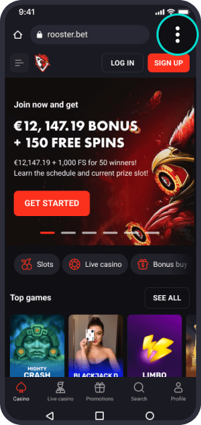 Go to the Rooster Bet homepage and tap three dots to open the browser menu.